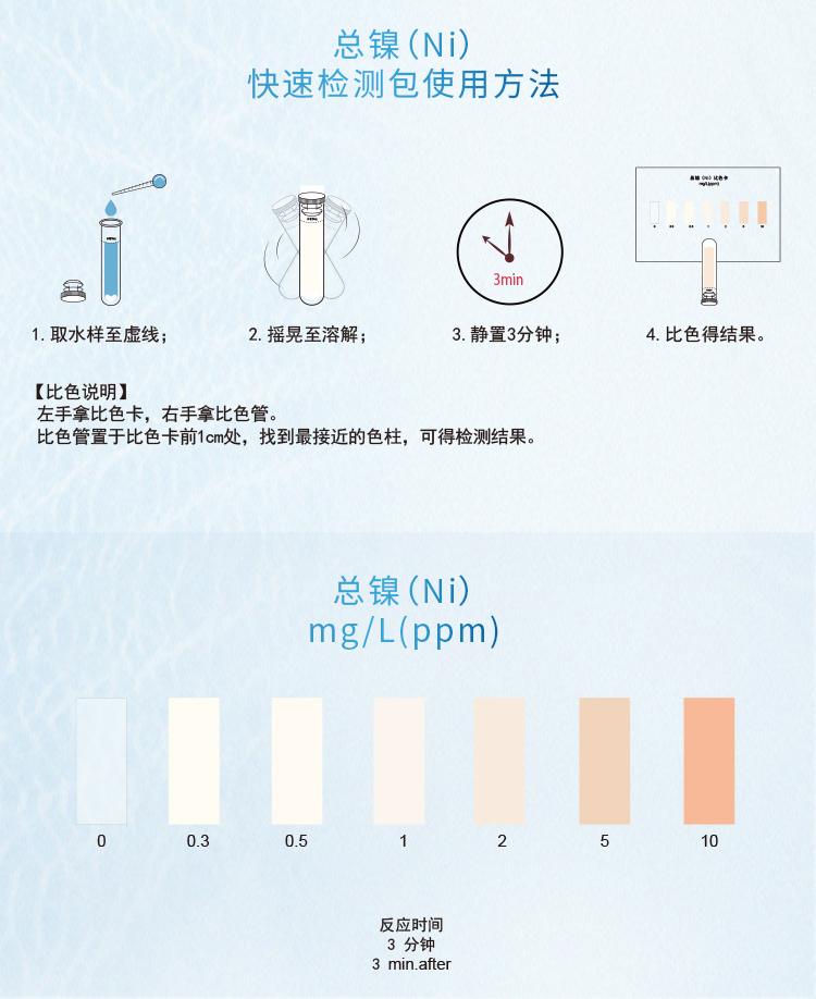 2.本產品檢測水中鎳離子(Ni2+)含量在0-5mg/L(ppm)范圍內,濃度過高會產生紅色沉淀而影響比色,若要檢測5mg/L以上濃度水樣,請預先稀釋水樣后再進行測定,具體操作見稀釋說明書。